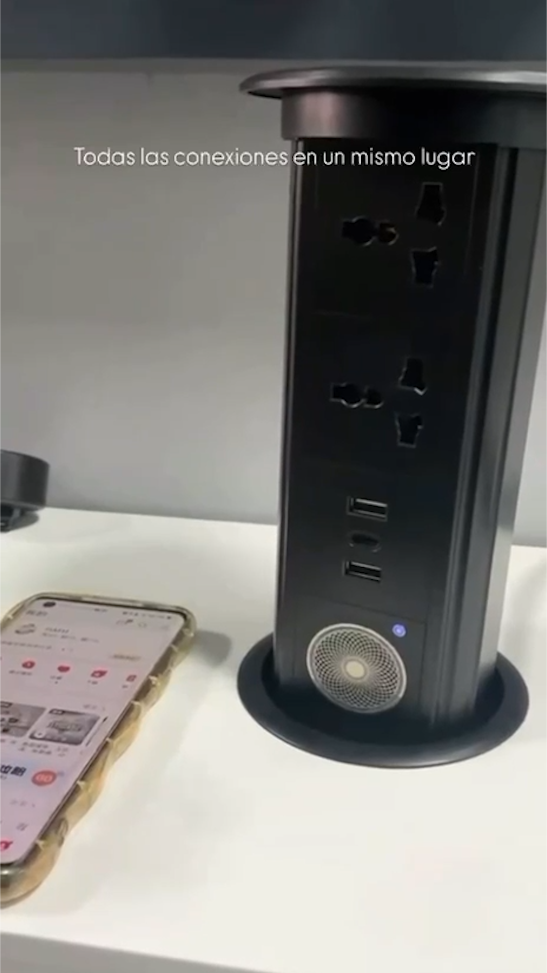 Un enchufe emergente con sistema de elevación eléctrica carga inalámbrica puertos USB sensor touchless y protección inteligente.