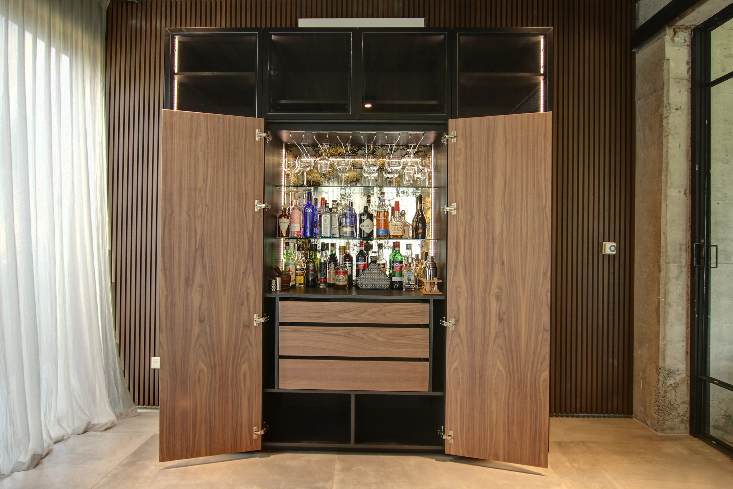 Bar Chester combina carpintería enchapada en madera natural con estructura metálica y vidrio, reinterpretando el clásico mueble bar con un lenguaje actual.